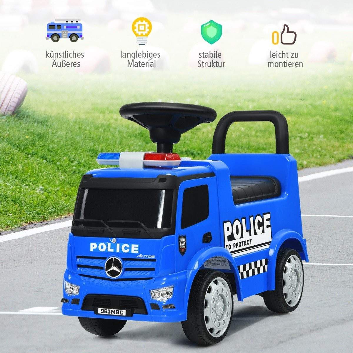 Mercedes Benz-kørebil med opbevaringsplads & horn & sirene & fløjte & advarselslampe børnepolitibil