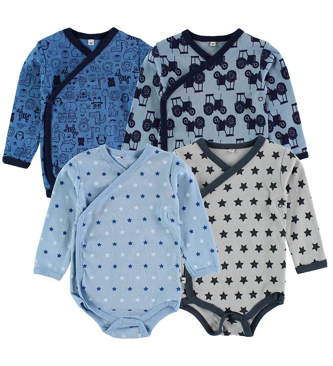 Pippi Baby Slå-om-Bodyer - 4-pak - Blå/Grå m. Print