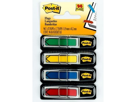Indeksfaner, Post-it, lille, med pile, 4 assorterede farver, 4 blokke a 24 ark